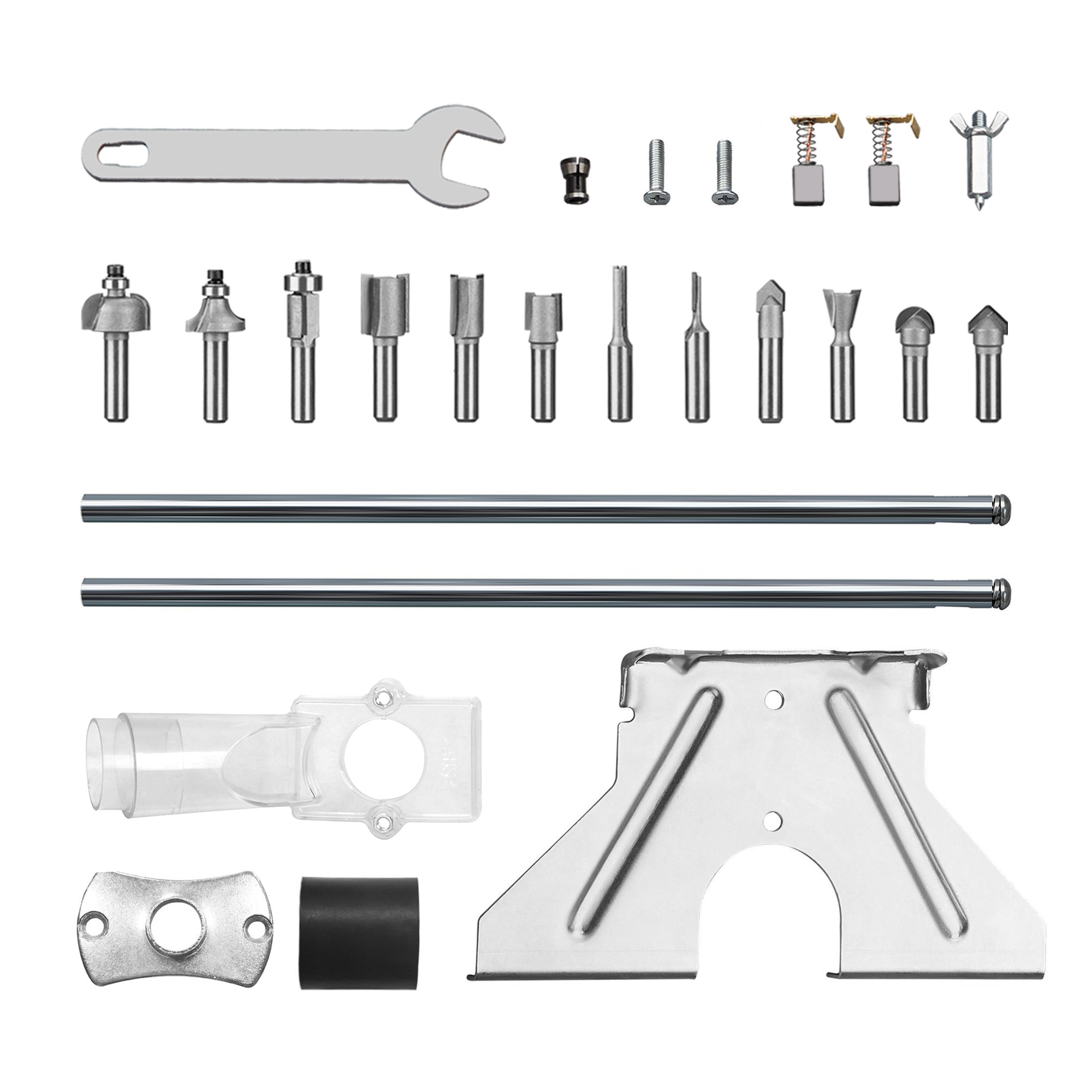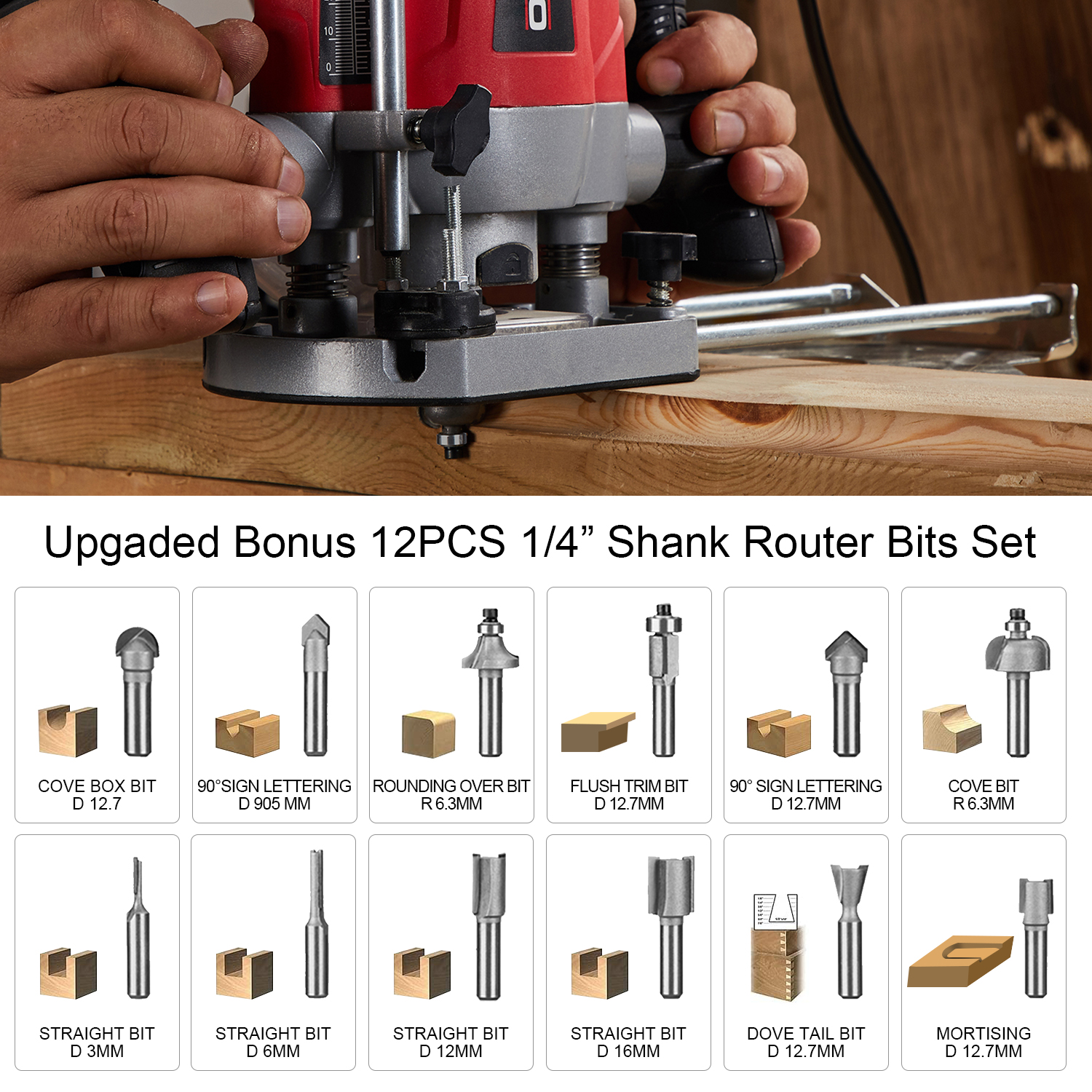 Reglare fina a inaltimii incorporata. Capacitate colier 6mm,8mm baza de taiere si sac de scule.